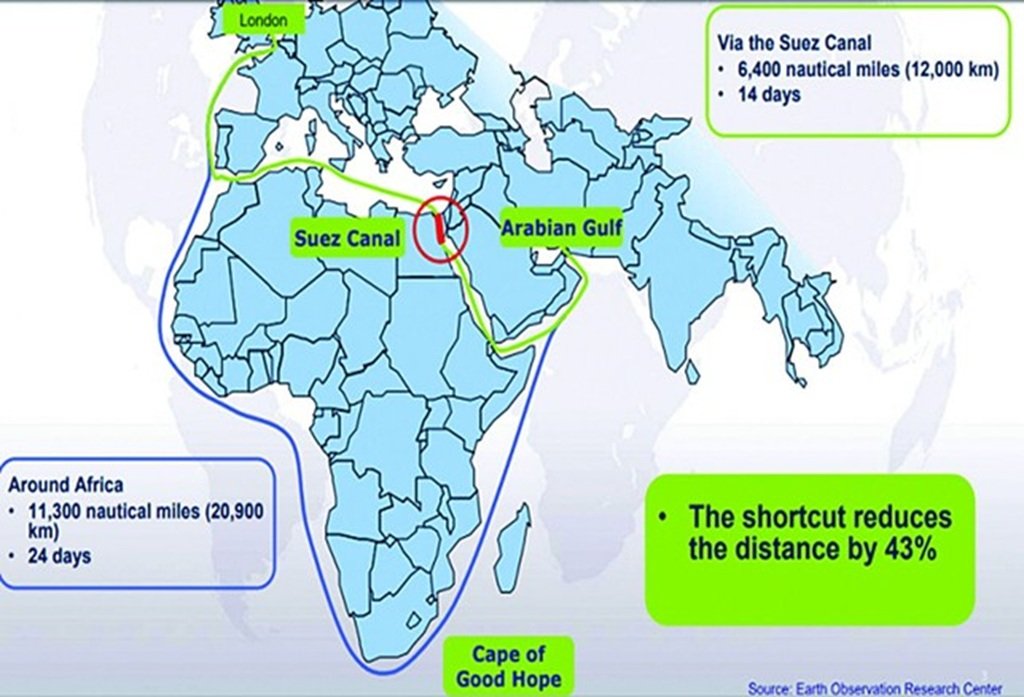 Historically, no project has impacted international relations as much as the construction of the Suez Canal. It is difficult to imagine any human achievement that could have altered the status of natural borders more dramatically. With a simple geographic surgical operation, the entire continent of Africa was reduced to a single metre. Due to its unique geographical location, the canal has become one of the most important canals and straits in the world. Its vital importance lies in its status as the most important trade artery linking the eastern and western hemispheres, and in its position as the shortest shipping route, reducing the distance traveled by ships crossing from the Red Sea to the Mediterranean and on to the Atlantic Ocean compared to using the Cape of Good Hope route around Africa.